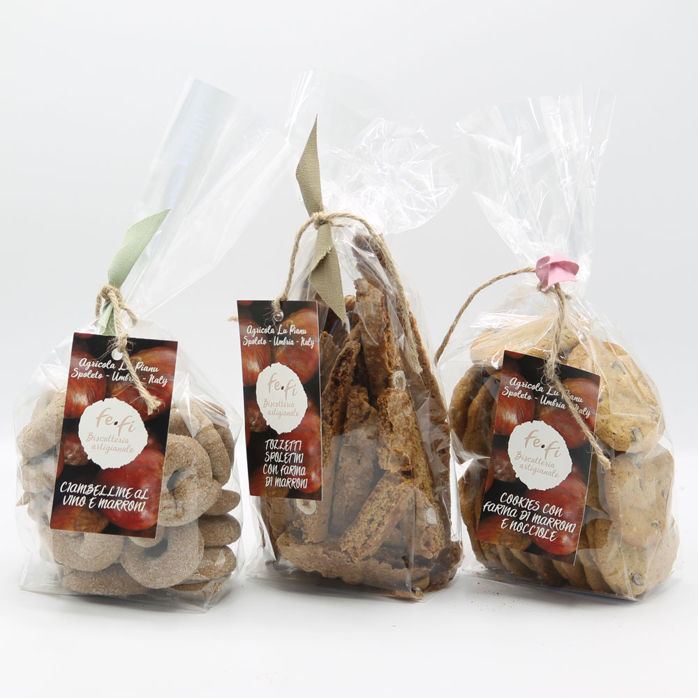 Una box con tutti i prodotti della Biscotteria Artigianale Fe.Fi, realizzati con farina di marroni, a km zero e con una grande attenzione alla scelta degli ingredienti per creare un prodotto di altissima qualità, ottimo nel gusto e perfetto dal punto di vista nutrizionale; la farina di castagne ha ispirato numerose ricette della tradizione popolare, quando il castagno veniva chiamato “albero del pane”, perchè i suoi frutti erano così nutrienti da riuscire a sfamare i contadini durante i periodi di carestia o gli abitanti delle zone in cui i cereali scarseggiavano.