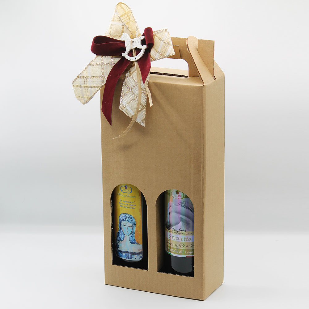 Una box con 2 bottiglie di vini umbri, da vitigni caratteristici della nostra regione: un Grechetto dell’Umbria e un Rosso di Montefalco, il primo ottimo per accompagnare antipasti, primi e piatti di pesce, il secondo ideale accompagnamento di piatti di carne. Le bottiglie fanno parte di una limited edition e personalizzate con etichette realizzate da artisti e pittori.