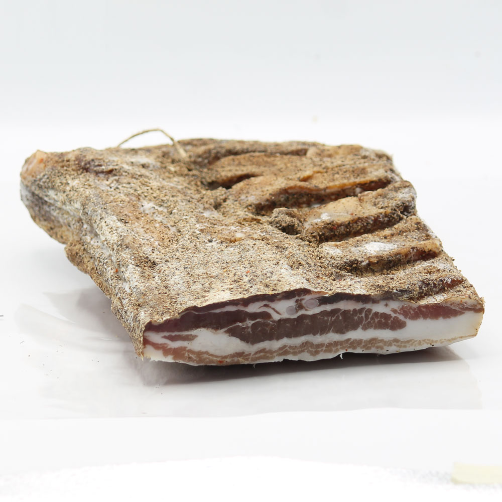 La pancetta tesa prende il nome dal fatto che il pezzo di carne da cui viene ricavata, la parte magra del ventre del maiale, sapientemente salata e aromatizzata, viene fatto stagionare nella sua forma originaria, a differenza della pancetta classica che ha forma circolare. Ha quindi una forma squadrata, rettangolare, e al palato si scioglie in bocca grazie alla venatura di grasso nobile della parte ventrale magra del maiale, per un sapore morbido e delicato.